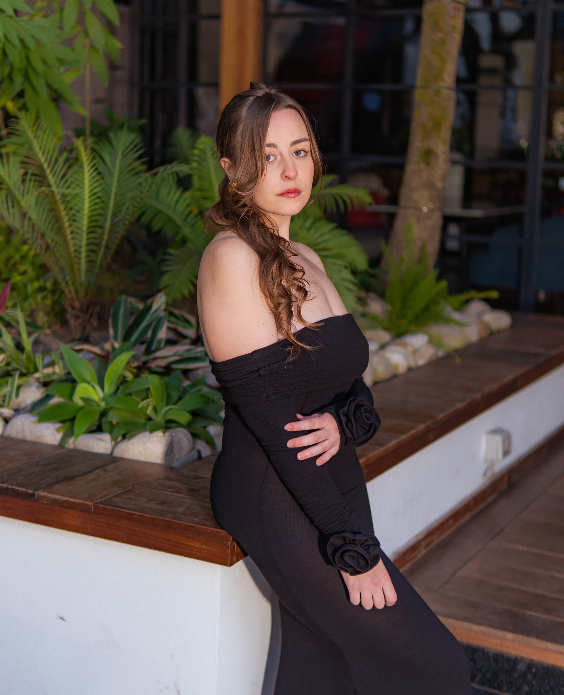 Black Bloom 3d patch flower maxi dress is a sultry off-shoulder masterpiece, crafted from a sculpting stretch fabric that contours your silhouette to perfection. The long sleeves feature handcrafted rosette cuffs, adding a touch of soft femininity to this bold and minimal design. Whether you're attending a gala, cocktail evening, or a moonlit dinner, this piece is your statement of effortless grace.