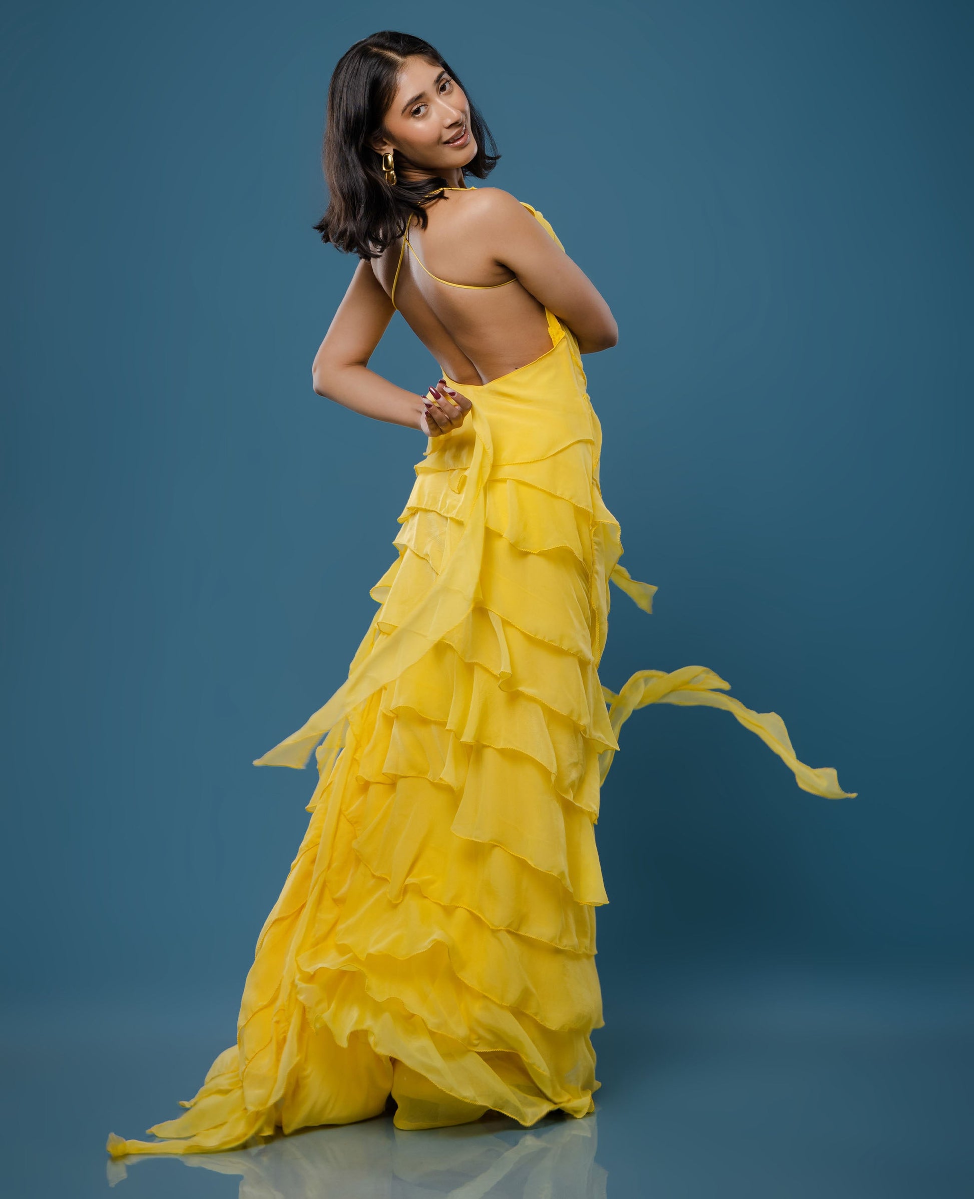This bright yellow ruffle maxi dress is perfect for summer days. It has a halter neck and an open back with crisscross straps. The soft, layered fabric flows beautifully, giving it a light and dreamy look. Ideal for beach holidays, brunches, or any summer event.