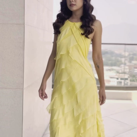 This bright yellow ruffle maxi dress is perfect for summer days. It has a halter neck and an open back with crisscross straps. The soft, layered fabric flows beautifully, giving it a light and dreamy look. Ideal for beach holidays, brunches, or any summer event.