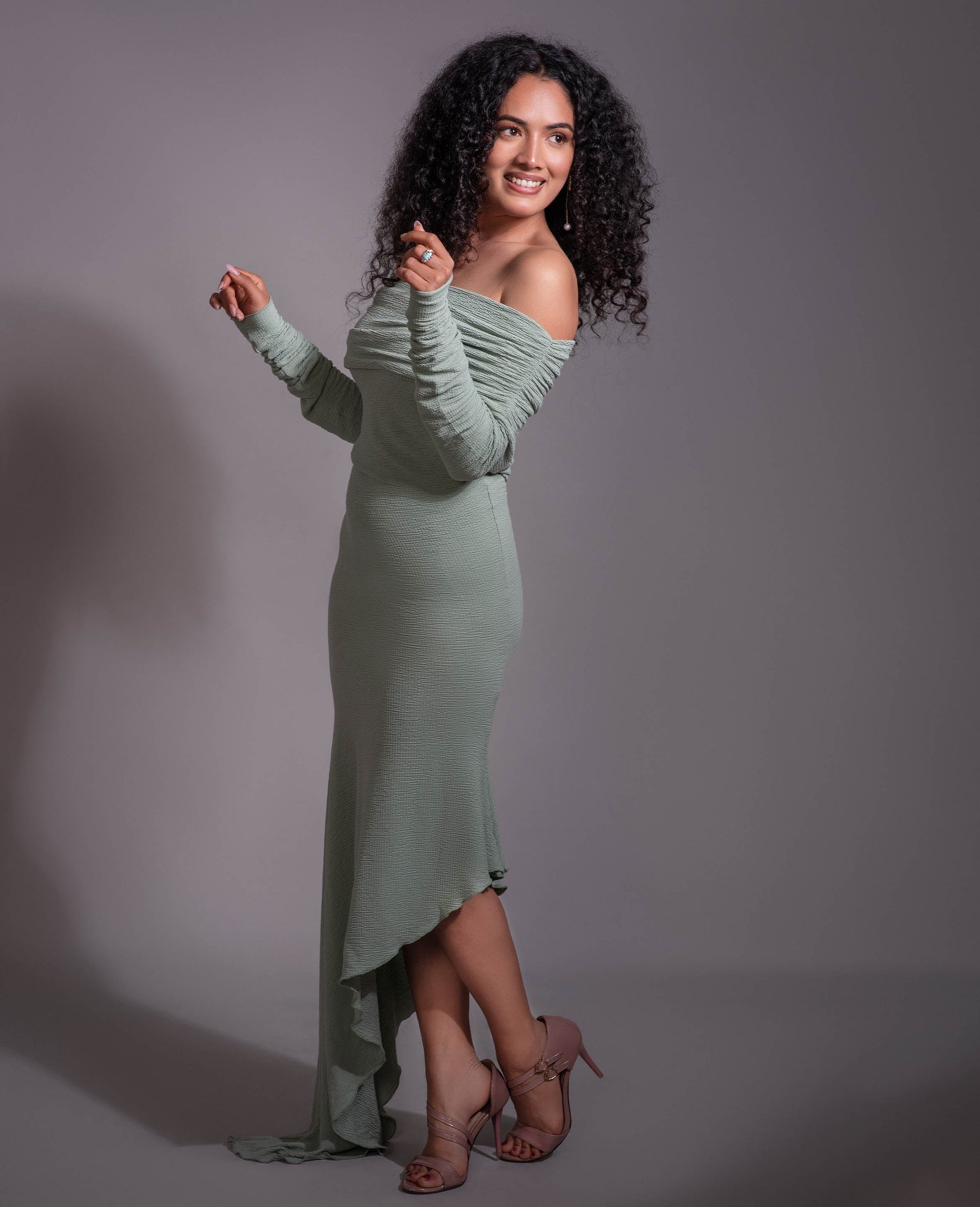 This Mint Bloom maxi has been expertly designed in a premium ribbed knit for a sculpting comfortable fit. It has an elegant bardot neckline with long feminine sleeves and a romantic skirt for added flare. Dress this style from day to night by styling with our hear me court heels and some gold accents.
