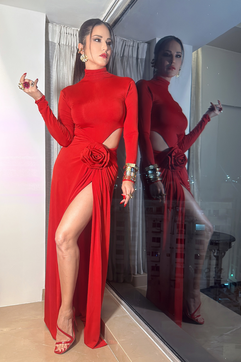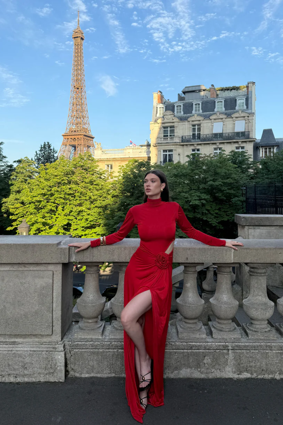 Our Rouge Romance maxi dress that speaks in petals and power. The Rouge Rosette Gown is tailored for the modern muse — sculpting the body with stretch jersey while a handcrafted rose blossom cinches the waist in timeless elegance. With a statuesque high neckline, a statement side cut-out, and a thigh-grazing slit, this piece is made for unforgettable entrances.