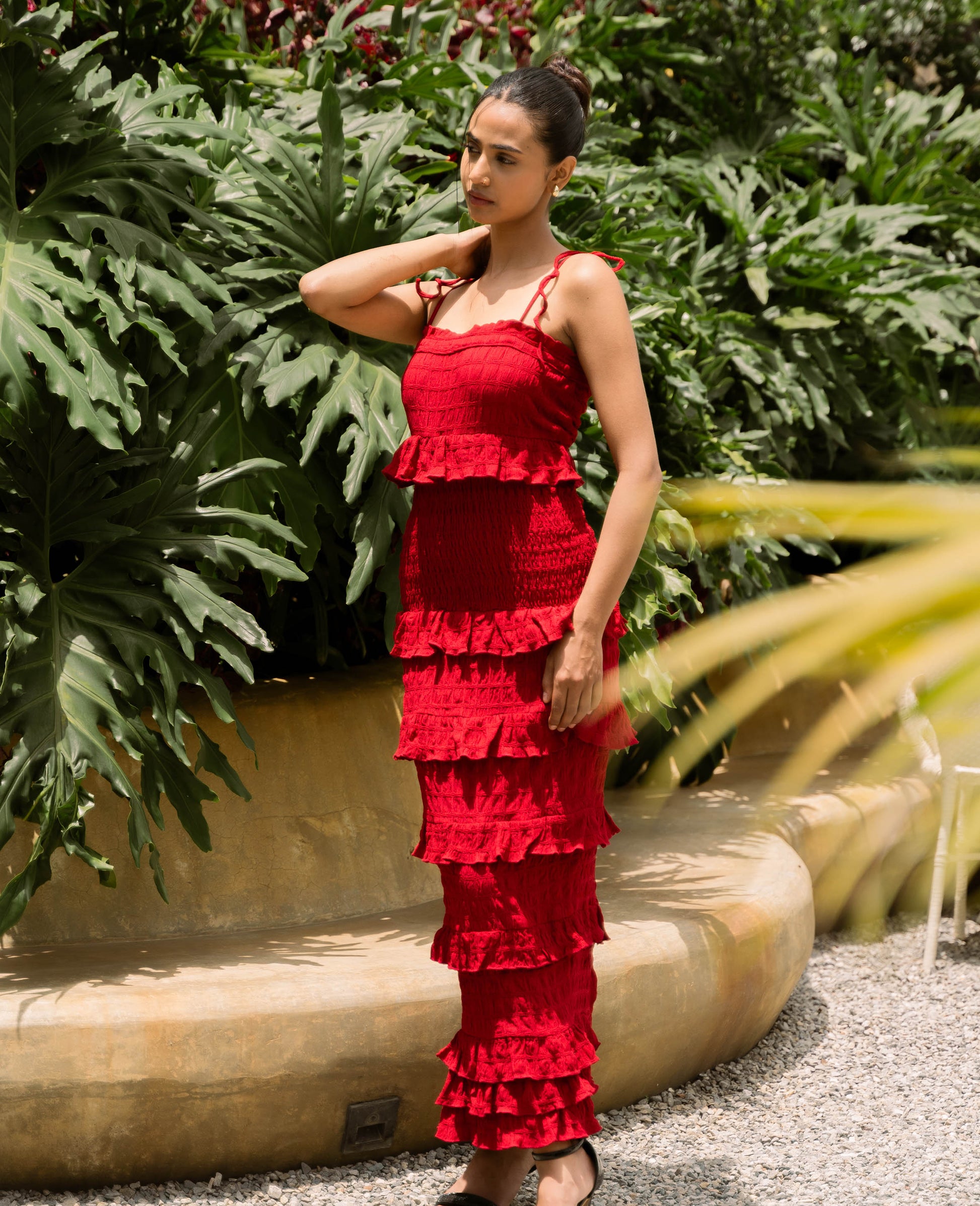 Bring some flair to your summer wardrobe with our Strappy Ruffled Maxi Dress. This stunning piece features delicate self-tie cami straps, figure-flattering ruching, and softly gathered ruffles for an effortlessly chic look. Perfect for an alfresco date night, pair it with gold accents and our Sweet Step heeled sandals for a glamorous touch.