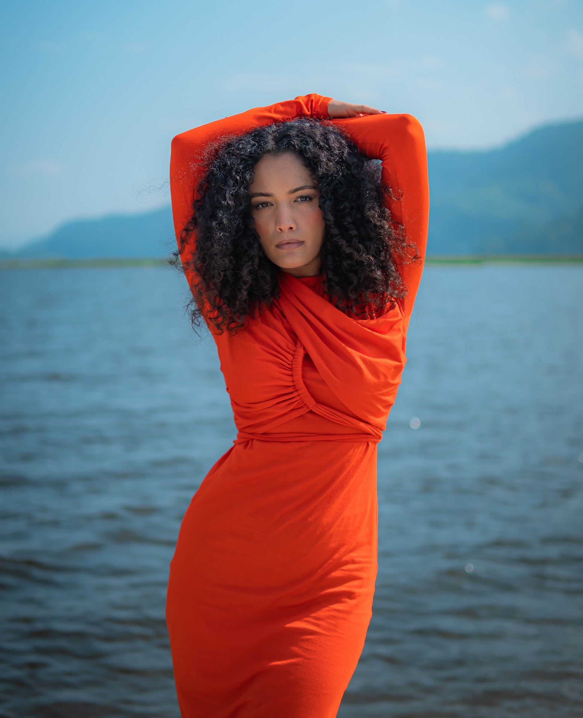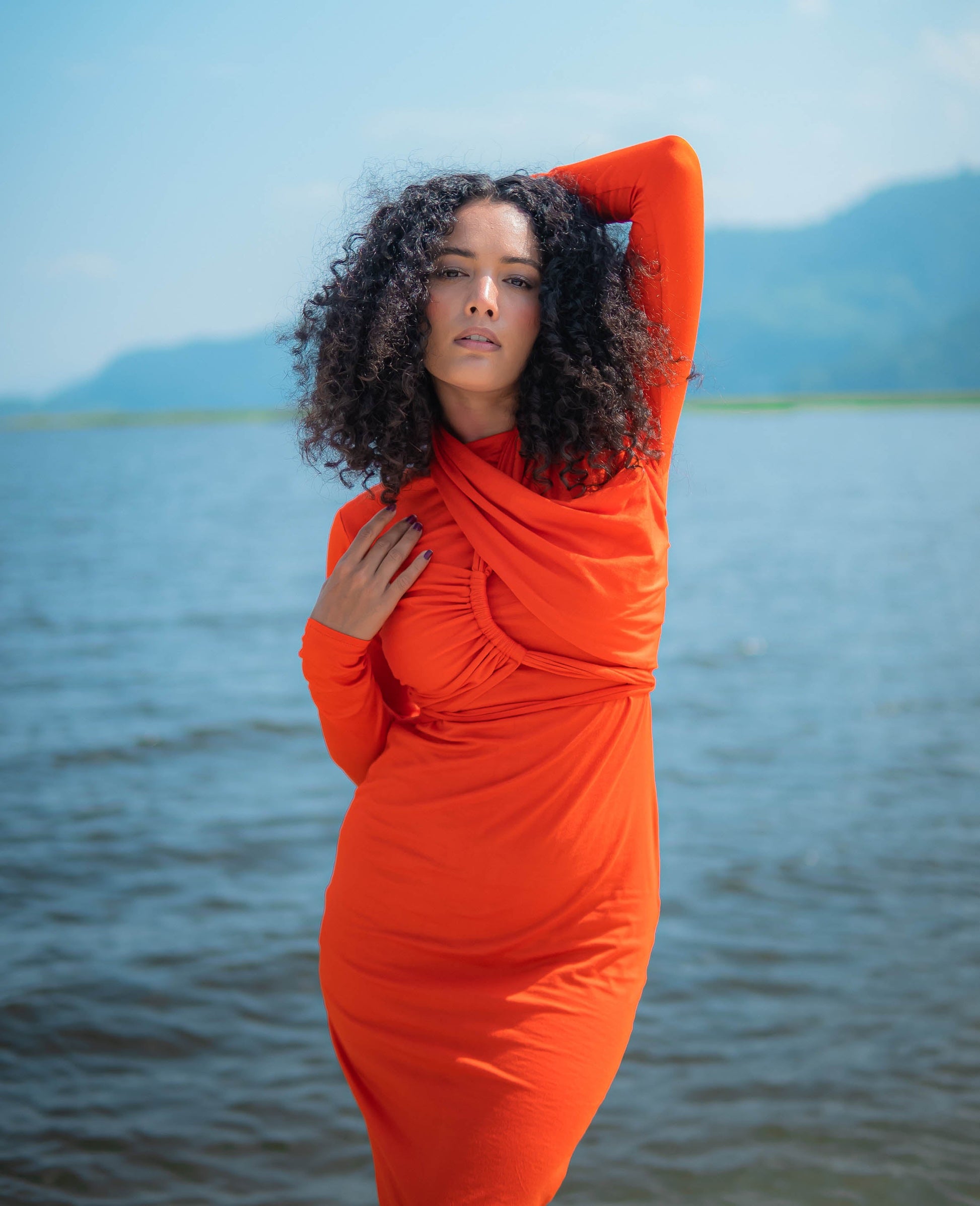 Our sunflare halter neck midi dress designed with a dramatic drape and halter neckline and a body fitting silhouette, this dress brings the heat to every occasion. The long sleeve creating a harmony of allure and sophistication.
