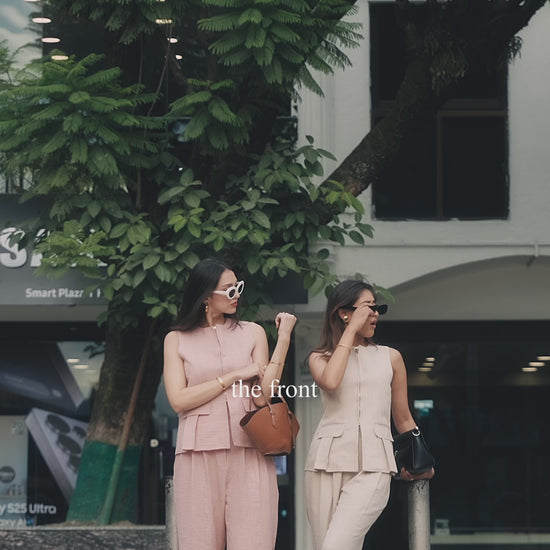 Turn heads with our impeccably tailored two-piece co-ord set that blends minimalism and sophistication. Crafted from a linen-polyester blend, this outfit is designed for warm-weather comfort while maintaining a polished edge. The sleeveless structured top features a sleek zip closure and subtle peplum detail for a flattering silhouette, while the high-waisted, wide-leg trousers create a lengthening effect that’s both chic and versatile.
